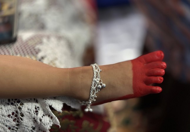 The youngster’s feet are painted red for the ceremony(Picture: Sunil Sharma/ZUMA Press Wire/Shutterstock)